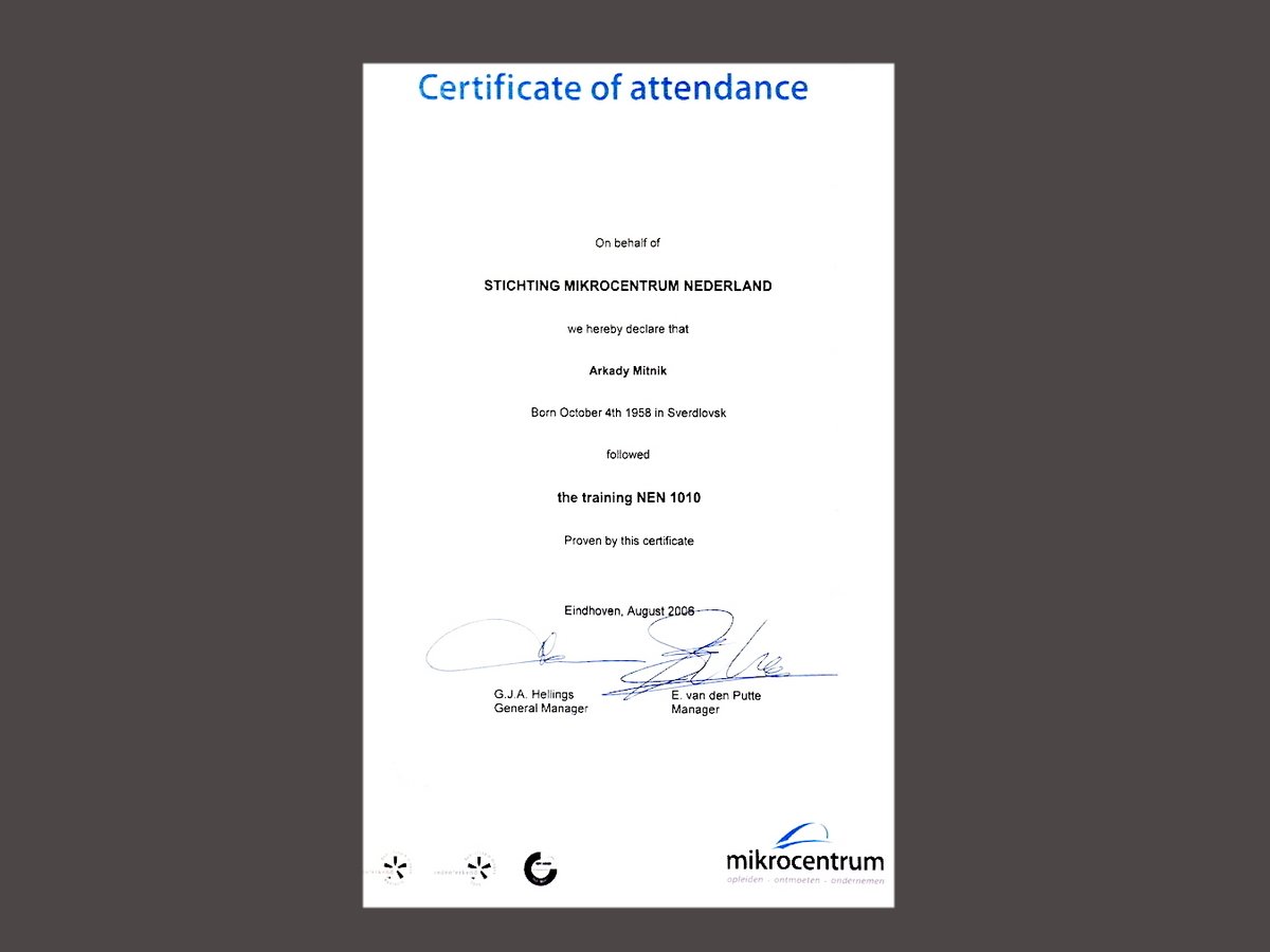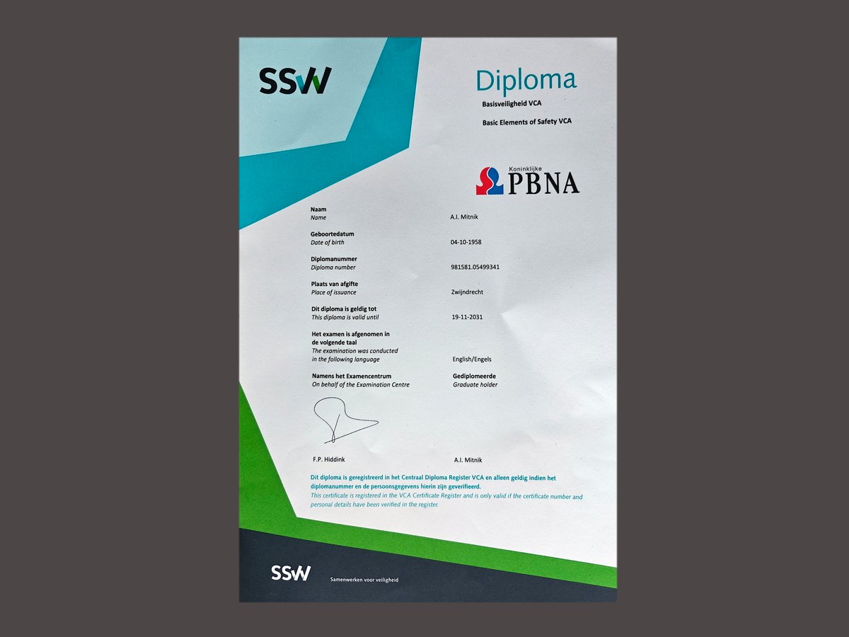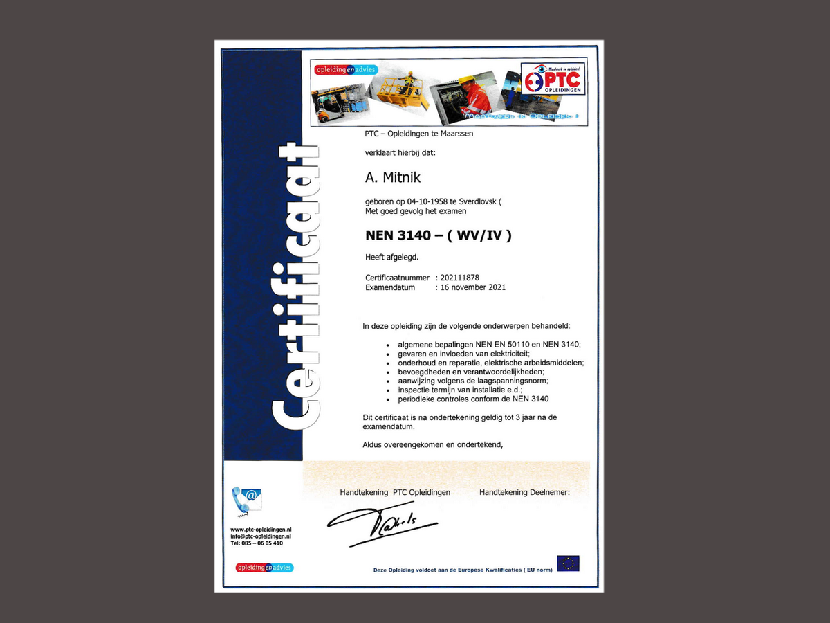In addition, we are certified for compliance with the Dutch NEN 3140 and NEN 1010 standards, as well as for Safety for Operational Supervisors (VCA).