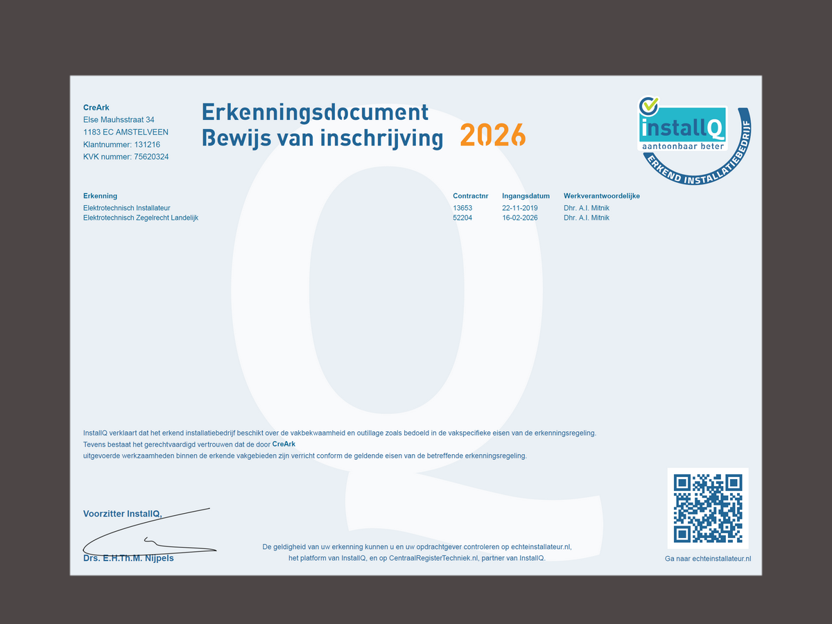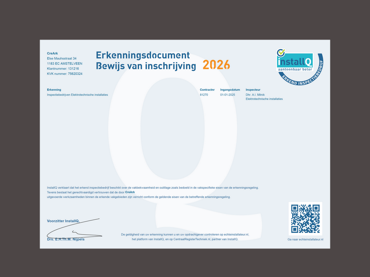 We are certified by the official Dutch INSTALLQ authority as a recognized (“erkend”) electrical installation and inspection company. This recognition confirms that all electrical work is carried out safely, professionally, and in accordance with the latest standards and technical knowledge. Clients can therefore rely on the quality and reliability of our services.